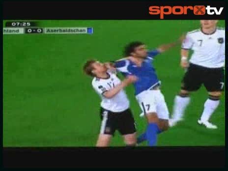 Suratı kanlar içinde kaldıAlmanya-Azerbaycan maçında Mertesacker'e yapılan sert müdahale.