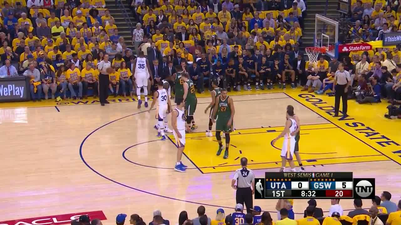 Steph Curry, Rudy Gobert'i kendi etrafında döndürdüğü bu crossoverı sonrası ters turnikeye gidiyor.