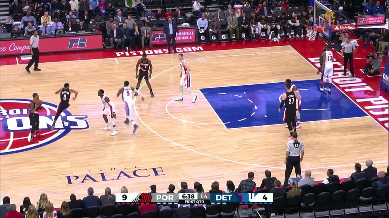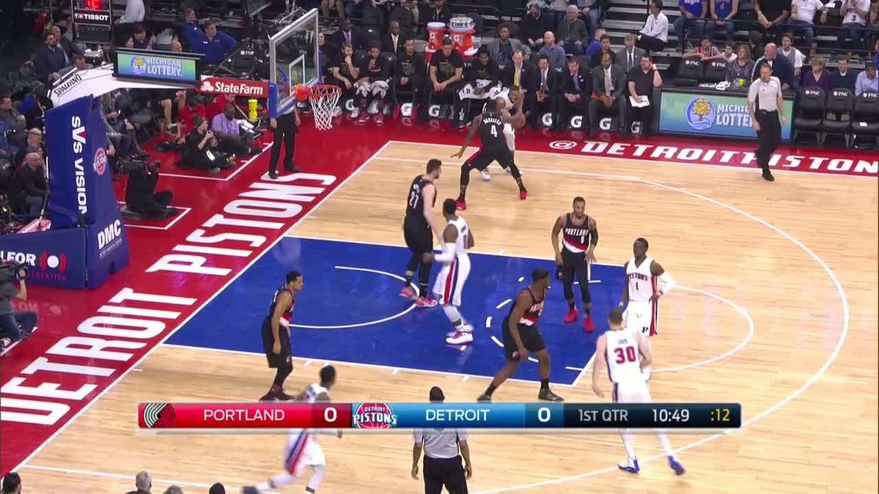 Andre Drummond, hızlı hücumda topu tam saha pasıyla Kentavious Caldwell-Pope'a, o da arkasından gelen Reggie Jackson'a veriyor.