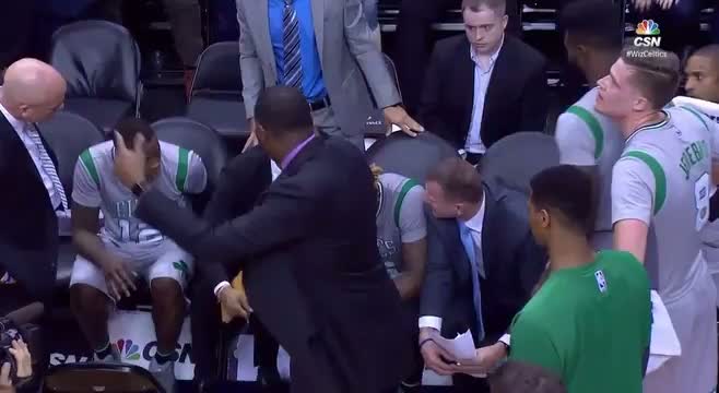 Boston Celtics point guardı Marcus Smart, dün gece oynanan Washington Wizards karşılaşmasının son çeyreğinde saha kenarında takımın yardımcı koçlarınd...