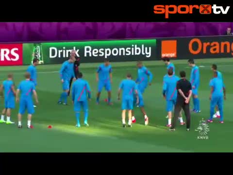 Galatasaray'ın yeni maestrosu Wesley Sneijder Hollanda Milli Takımı'nın idmanında yaptığı bir hareketle takım arkadaşlarının alkışını alıyor..