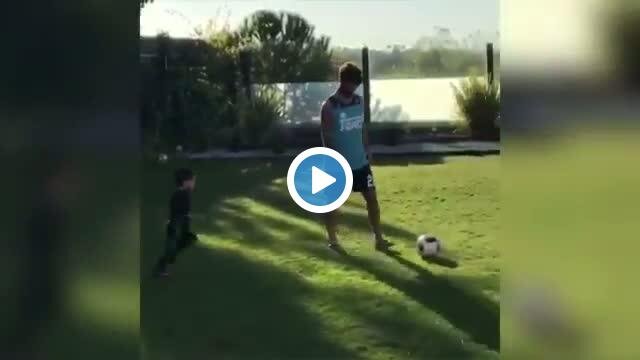 Real Madrid'in İspanyol yıldızı Isco, evinin bahçesinde çocuğuyla top oynarken dahi çalım atma huyundan vazgeçemiyor.