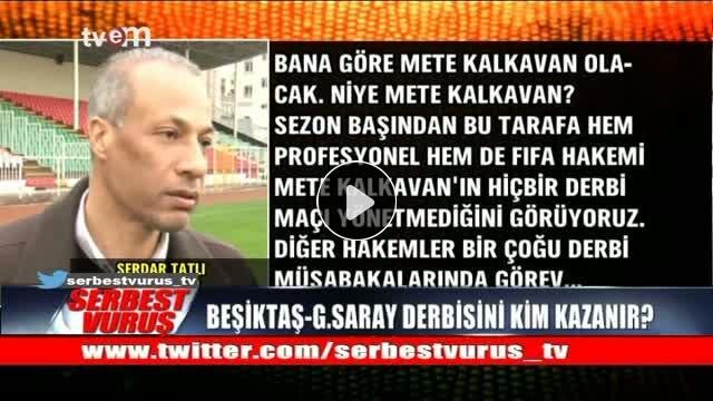 "Beşiktaş Galatasaray derbisini Mete Kalkavan yönetecek..." Bu sözler eski hakem Serdar Tatlı'ya ait. Serdar Tatlı geçmiş dönemlerde de önemli maçlar öncesinde TVEM'de yayınlanan Serbest Vuruş programında tahminde bulunmuş ve tahminlerinde yanılmamıştı. İşte Serdar Tatlı'nın derbi için söyledikleri...Yorumlar