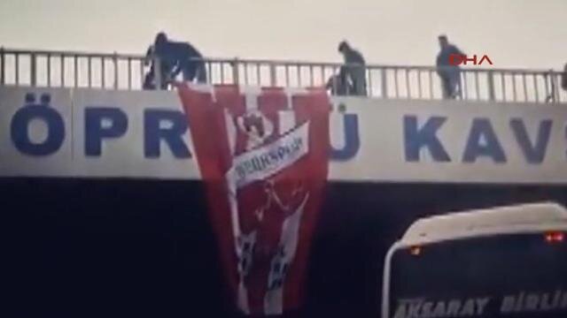 Nevşehirspor taraftarlarınca çevreyolu üzerindeki köprüye asılan Nevşehirspor flamasının bir grup 68 Aksaray Belediyespor taraftarı tarafından söküler...