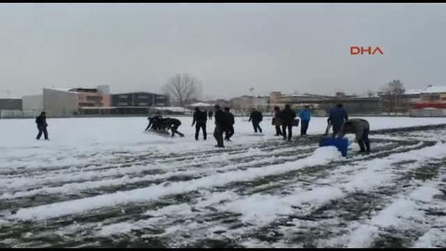 İnegöl Doğugücüspor ile Gürsü Yenidoğanspor arasında İnegöl'de oynanan Amatör Süper Lig maçından önce karla kaplı olan sahayı, ev sahibi takımın yönet...