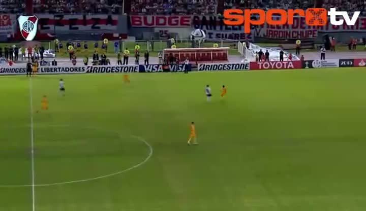 Copa Libertadores'te oynanan River Plate - Tıgres maçında River Plate forması giyen Jose Ramiro Funes Mori, takım arkadaşı Julio Chiarini'nin müdahale...