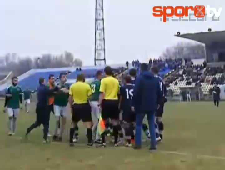 Ukrayna'da bir amatör turnuvada oynanan maç sırasında hakeme itirazlarda bulunan Mayak takımı futbolcuları arasından fırlayan yedek oyuncu Igor Nosare...