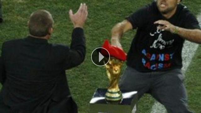 2010 Dünya Kupası Finali'nde, kupaya dokunmak isteyen bir taraftar son anda yakalandı.