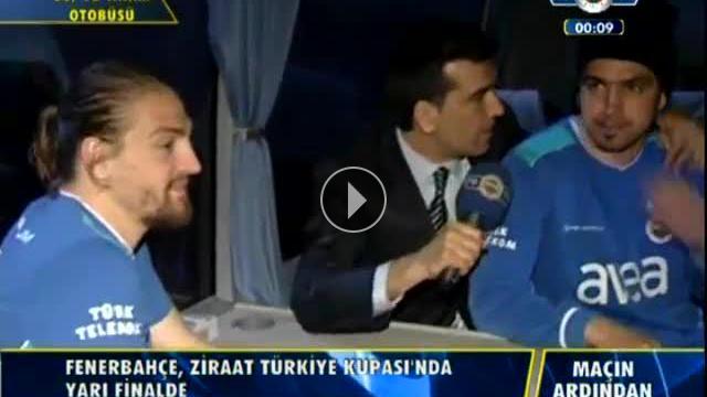 Spor Toto Türkiye Kupası'nda Kayserispor maçı sonrası Fenerbahçeli oyuncular takım otobüsünde FBTV'ye açıklamalar yaptı. Bir ara mikrofonu eline alan ve muhabirliğe soyunan Mehmet Topuz'un Gökhan Gönül ile yaptığı komik röportaj...Yorumlar