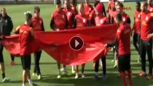 Galatasaraylı futbolcular sabah saatlerinde yapılan antrenmanda Türk bayrağı ile fotoğraf çektirdi.