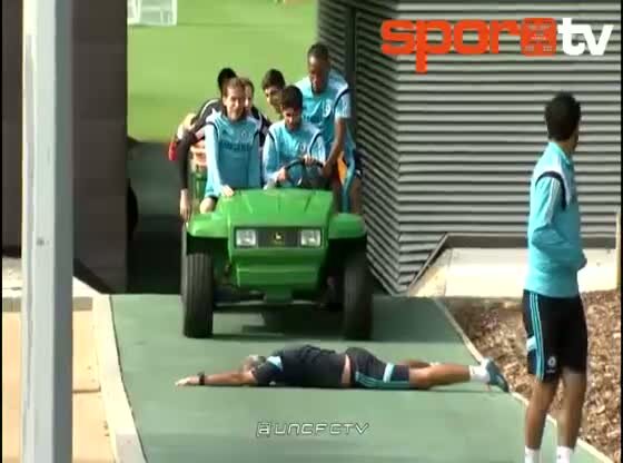 Chelsea antrenmanı öncesi yıldız isimler Didier Drogba önderliğinde sahaya tesisin malzeme aracı ile gittiler.