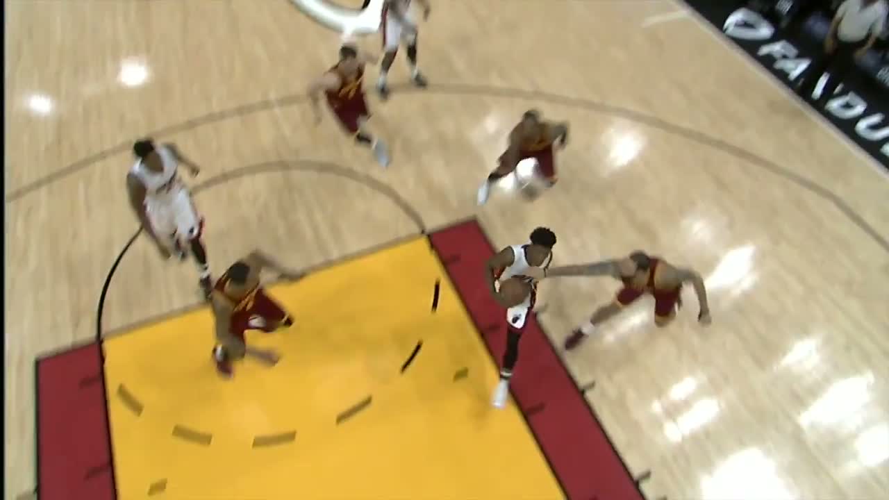 Hield, Derrick Jones Jr.'a karşı 'in-n-out' crossoverını yaparak kendine alan açıyor ve içeri girip basketi buluyor.