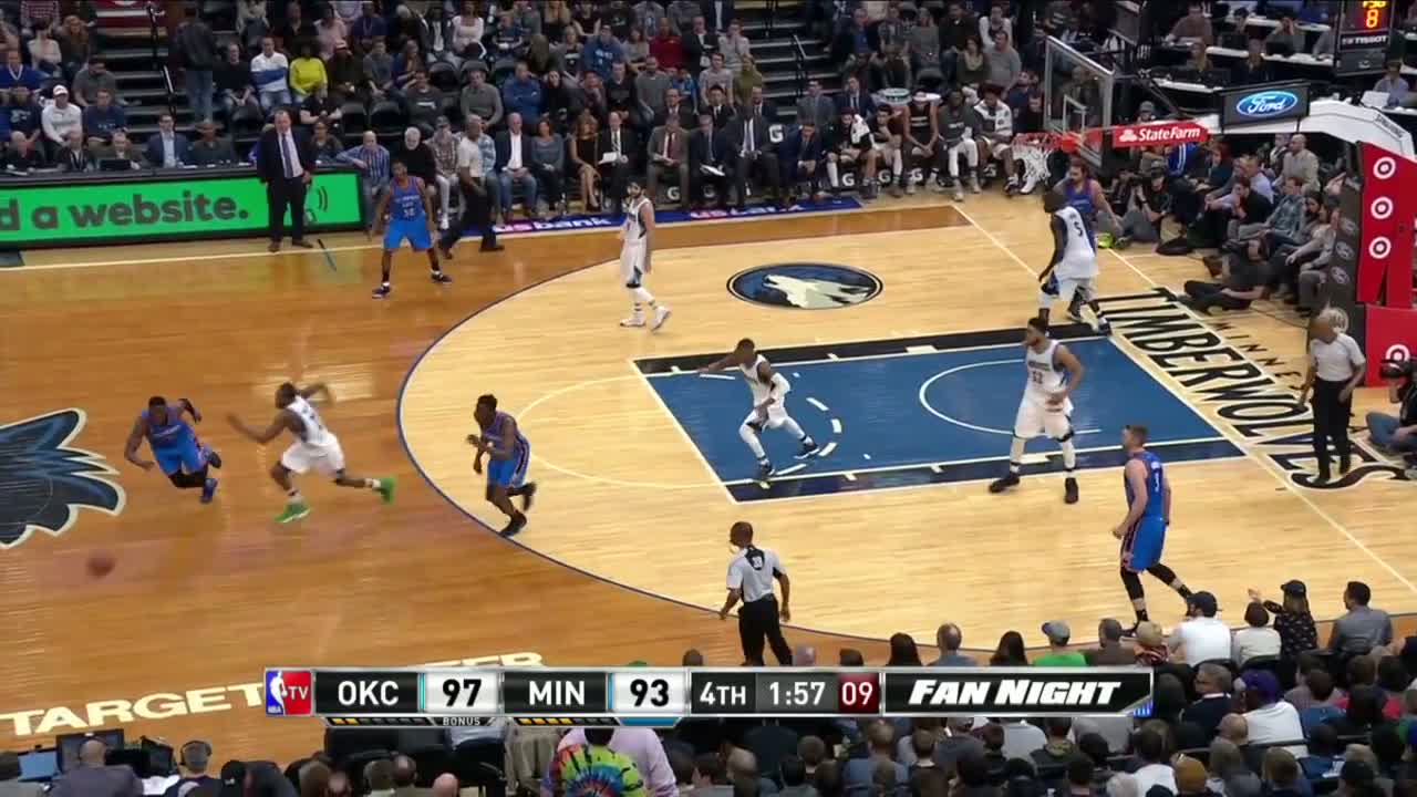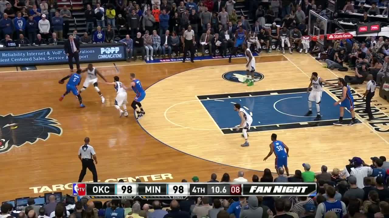 Rubio, kendisine düşen hücum ribaundını alarak hiç vakit kaybetmeden pota altındaki Gorgui Dieng'i görüyor.