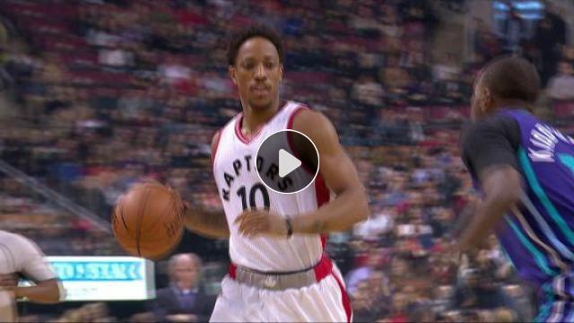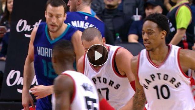 DeMar DeRozan arkasında bulunan Jonas Valanciunas'a bakmadan pası yolluyor ve JV de smacı vuruyor!