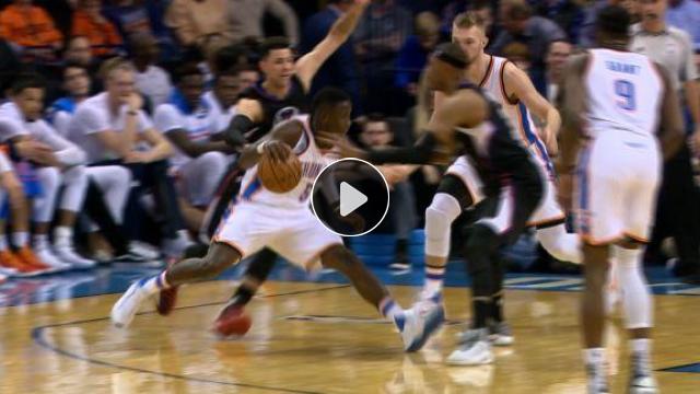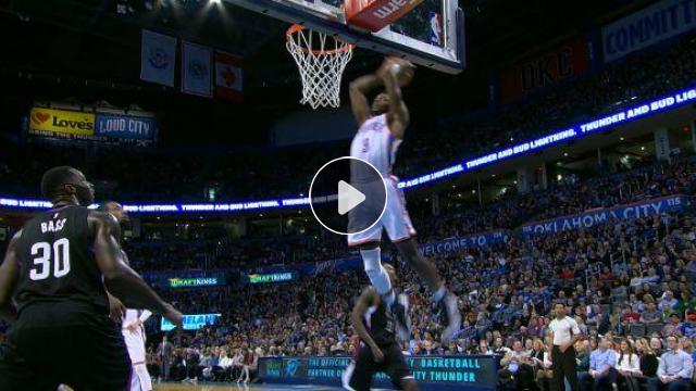 Oklahoma City Thunder'ın çaylak yıldızı Domantas Sabonis, çok sert bir blok yapıyor ve ardından Victor Oladipo üçlüğü gönderiyor.