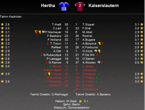 Herta Berlin'de maça 11'de başlayan Tunay Torun sadece ilk 45 dakikada görev yaptı. Ayrıca Herta Berlin'in tek golünü atan Peter Niemeyer, 77. dakikada ikinci sarı kartını görerek oyun dışında kaldı. Kaiserslautern'de ise Olcay Şahan maça 11'de başladı ve 90 dakika sahada kalırken; ilk golün asistini yaptı.
