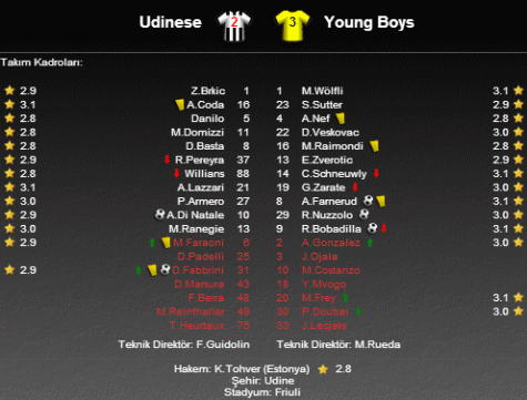 UEFA Avrupa Ligi A Grubu'nda İtalyan ekibi Udinese ile İsviçre temsilcisi Young Boys karşı karşıya geldi. Kendi sahasında rakibini 3-1 mağlup eden Young Boys, İtalya'da da 3-2'lik skorla galibiyete ulaştı.