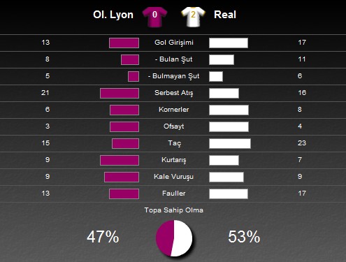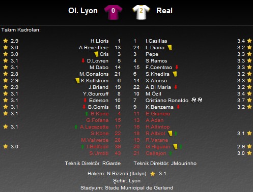 Kulüpler bazında Avrupa'nın en büyük futbol organizasyonu olan Şampiyonlar Ligi'nde D grubu karşılaşmasında Fransız temsilcisi Olympique Lyon'un konuğu İspanyol devi Real Madrid'ti. Stade de Gerland'ta oynanan maç 2-0 Real Madrid üstünlüğü ile bitti. Goller megastar C.Ronaldo'ya aitti.